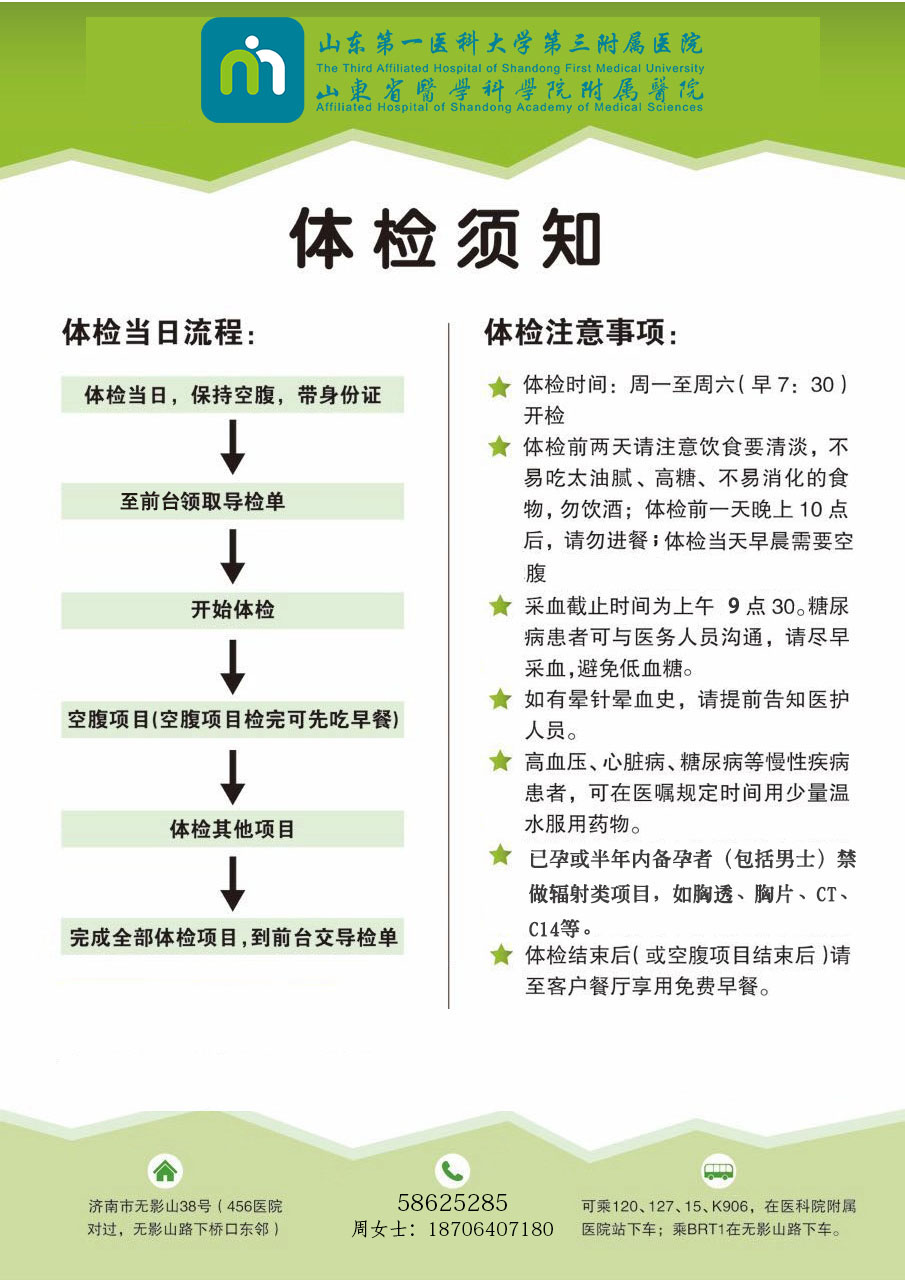 (二)體檢地點(diǎn):山東省醫(yī)學(xué)科學(xué)院附屬醫(yī)院體檢中心(位置:濟(jì)南市無(wú)影山38號(hào)(456醫(yī)院對(duì)面)1號(hào)樓查體中心);